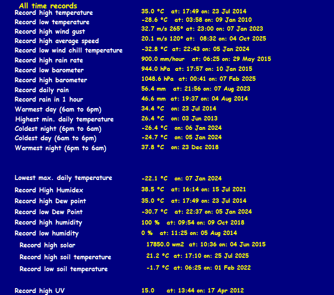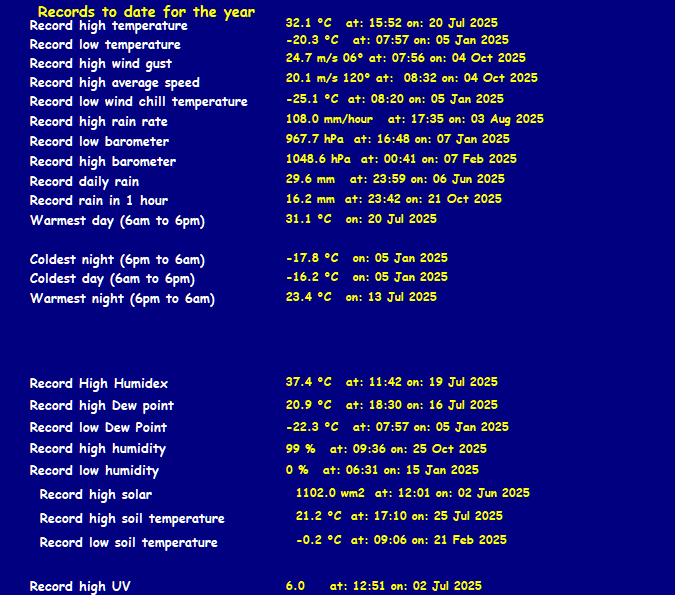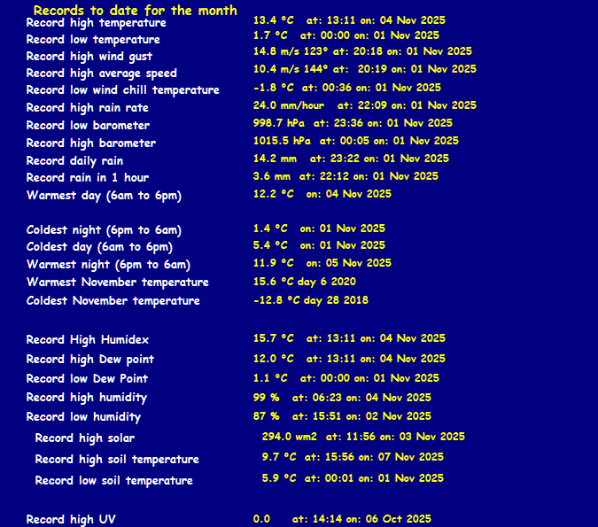| Maximum solar (since midnight) | 25 W/m² | Maximum UV (since midnight) | 0.0 |