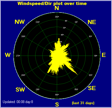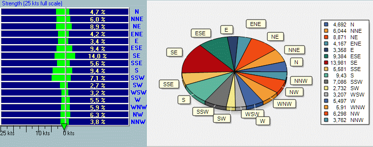 Maximum windspeed = 9.8 m/s from 132°( SE) on day 01 at time 20:20